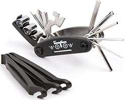 ![]() | WOTOW 16 in 1 Multi-Function Bike Repair Tool. Best price on Amazon right now: | This is the number 1 best-selling bike repair tool kit on Amazon & with our readers. Every cyclist needs a good all-in-one tool kit in their saddle bag! The kit includes: Allen Keys: 2, 2.5, 3, 4, 5, 6; Socket Hex Wrenches: 8/9/10/mm, a slotted screwdriver, a Phillips screwdriver, a Socket Extension Rod, a Solid Wrench: 8/10/15/mm; a Hex Key Wrench: 2/2.5/3/4/5/6mm; a Spoke Wrench; & 3 nylon tire rods |