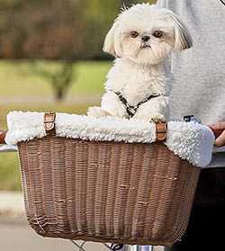 ![]() | PetSafe Happy Ride Wicker Bicycle Basket for Dogs and Cats. Best price on Amazon right now: | This is a stylish wicker pet basket with a comfortable sheepskin liner that can be easily removed and cleaned. It’s an ideal pet basket if the cyclist you love has a dog that is 13 pounds or less. Or if the dog you love is that size! A removable sun shield is included. Front mounted baskets are ideal if you like to keep a watchful eye on your small pet. This basket could also be used for groceries or other luggage. For more pet basket choices, click here to see our comparison of 5 of the best pet bike baskets |