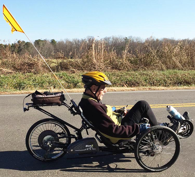 Dr. Len is 80 years old and lives in the Piedmont area of North Carolina. He has cycled since he was a teenager, but found himself slowing down recently due to aging and a few neurological problems. At this point most people would have quit. Instead, Dr. Len bought an electric recumbent trike, and has upped his weekly mileage! Dr. Len notes that his trike is very stable and comfortable, and that trikes like these can be ridden by people with significant handicaps. Another senior in his area has had a severe stroke, but he is out on his trike almost daily.