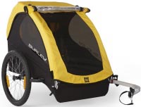 ![]() | • Trailer. • Can be attached to the seat post of almost any bike. | Can carry up to two children; rated for up to 100 pounds (45 kg) | • Highly rated by users. • Exceeds ASTM standards for safety and durability. • Lightweight. • Hammock-style seat for comfort. • Two 5-point harnesses so you can carry one or two children. • Windows have UPF 30 sun protection. • Full internal roll cage. • Rear cargo space. • Bright colors. • Reflective elements. • Comes with neon orange safety flag. | Usually around $400 - please click here for current best price |