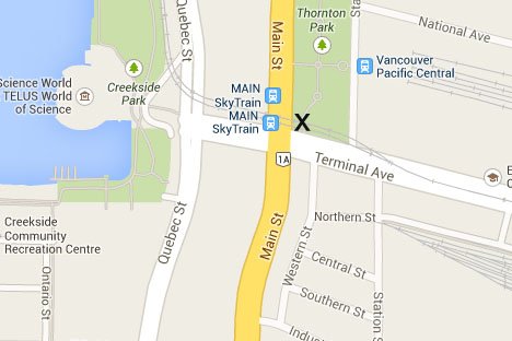 One that really INFURIATES me is the very dangerous spot at Main and Terminal, for cyclists heading north on Main. Most of the way cyclists get to share an entire lane with only buses (!). But as you cross the always-busy intersection at Terminal, there is suddenly NO LANE ( X marks the spot on the map).