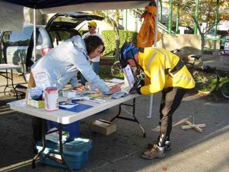 In typical Vancouver fashion, Monday’s “hurricane” was followed by a perfect Fall day, gloriously sunny. I easily found the station, on the BC Parkway. Lisa, a dedicated volunteer, was busily helping cyclists to enter the daily competition, select free bike route maps, and join the VACC.