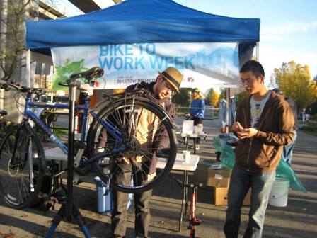 Undaunted by Monday’s volunteering stint at a VACC Bike to Work Week Station in a torrential downpour, I set off yesterday afternoon to help out at a station near Metrotown. It was a great experience – and this time I was able to help out a little.