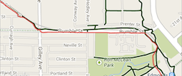 The map shows the spot I am talking about. The route depicted (in red) is one I did last week, when the route was closed, and I was forced to bike along Rumble.