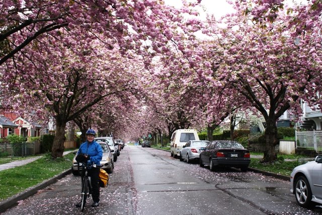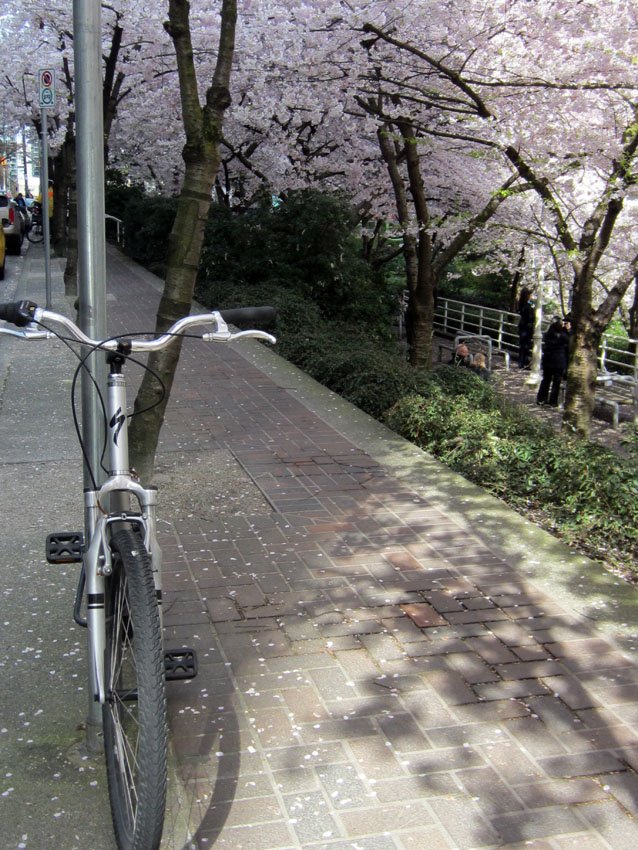 Spring is finally, really here. I saw the first sleeveless-cyclist on Granville today! And the trees are blossoming.