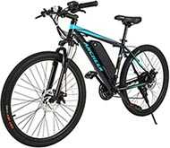![]() | Approximately $500; please click here for exact current price. Note: No. 1 Best Selling Ebike on Amazon | Mountain EBike, best for people who want quality components in an ebike that looks like a regular bike; best for heavier cyclists; rated for riders up to 300 pounds | 350 Watts motor with 36V/7.8Ah lithium battery; range: up to 30 miles with a lot of pedaling | Ride as a regular bike; or with 3 levels of power assistance for your pedaling; or with throttle power only (no pedaling) | 21 Shimano gears; Mechanical disk brakes |