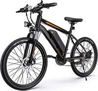 Oraimo Electric Mountain Bike, 26" ![]() | Approximately $700; please click here for exact current price | Mountain EBike, best for heavier cyclists who want a powerful, highly-rated motor; rated for riders up to 309 pounds | 350 Watts Bafang motor with 36V/13AH lithium battery; range: 29 to 45 miles | Ride as a regular bike; or with 3 levels of power assistance for your pedaling; or with throttle power only (no pedaling) | 21 Shimano gears; Front and rear mechanical disk brakes |