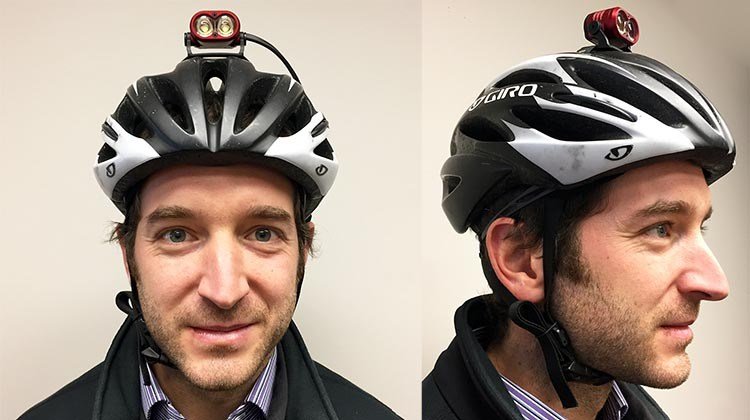 The Lumintrail headlight can be mounted on your handlebars or on your helmet. I like to wear it on my helmet.This is because I like to be able to point the light towards motorists who don’t seem to have noticed me, and occasionally watch raccoons running along the sidewalk – and of course, avoid blinding people. It was really a cinch to mount the light on my helmet, thanks to a good mount and tons of Velcro.